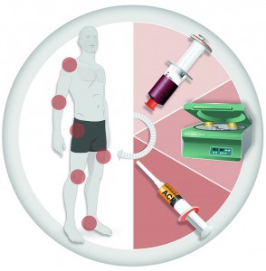 Anschließend wird die körpereigene Lösung in das betroffene Gelenk injiziert. Dies geschieht mittels einer speziell entwickelten Doppelspritze (Arthrex Double Syringe). Dieses neu entwickelte Doppelkammersystem gewährleistet die sterile Gewinnung und sterile Injektion der Wachstumsfaktoren und bietet so höchstmögliche Sicherheit.
